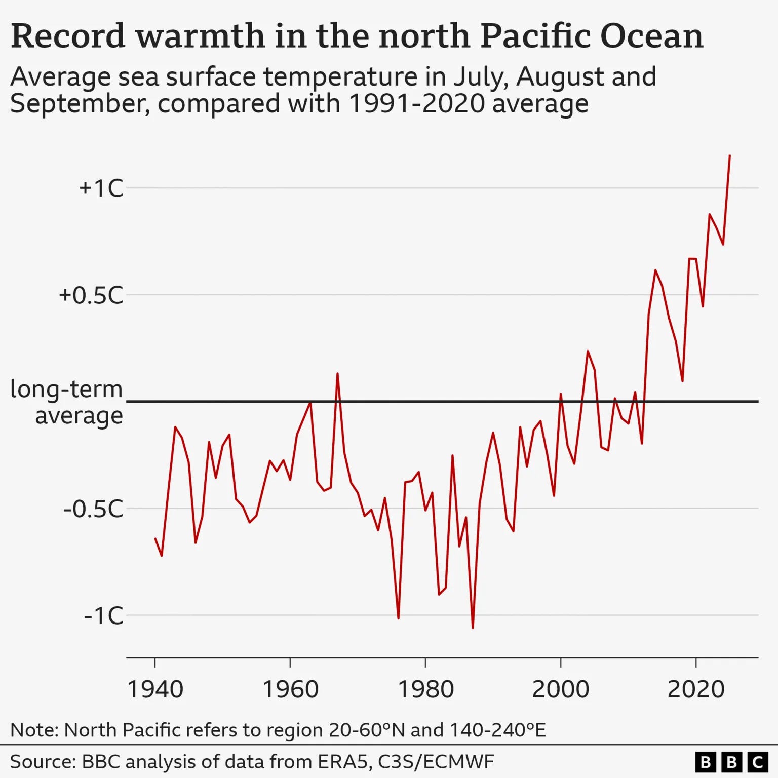 le acque del Pacifico settentrionale hanno vissuto l’estate più calda mai registrata (“The hottest summer on record”, colonna sonora adeguata alle Polpette). tra luglio e settembre le temperature della superficie del mare sono state superiori di oltre 0,25 °C rispetto al precedente massimo del 2022, un notevole aumento su un’area grande circa dieci volte il Mediterraneo.
